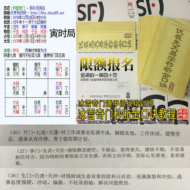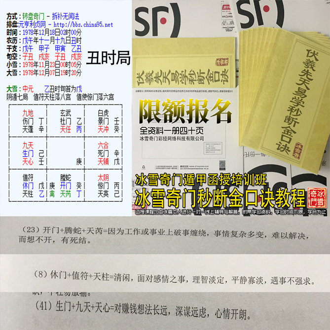 冰雪奇门遁甲先天易学|《冰雪奇门秒断金口诀》案例分析。【伏羲先天易学冰雪奇门遁甲】旨在弘扬真正之国学,传播正确之易理。八卦有先天和后天之分,古有伏羲氏画先天八卦,邵康节创先天易学,以先天八卦为理论基础和指导思想之先天易理乃方术之大根大本,而奇门遁甲为方术之首,配先天八卦乃易理之大宗;后天八卦以当时当地情况而强行对应物质世界,实质并不能放之四海而皆准,不具有广普性,流传至今的易学已支离破碎,没有一套是完整的,绝大部分违背了易理,也不能被证实。正确的易理符合客观规律、符合唯物辩证。一切不能被证实、经不起反推检验的易学都为伪易学!冰雪在此提醒广大易学爱好者:尊崇易理,远离大师。当代以先天八卦为基础用于教学的易学研究者屈指可数,【冰雪奇门遁甲学派】所传授之易理与【先天奇门王氏学派】截然不同,请大家在求学之路上谨慎选择,以免被其错漏百出的“理论”所误导!针对此学派之谬论冰雪已作出点对点的评析,详情请参看《批先天奇门王氏学派之十大谬论》。