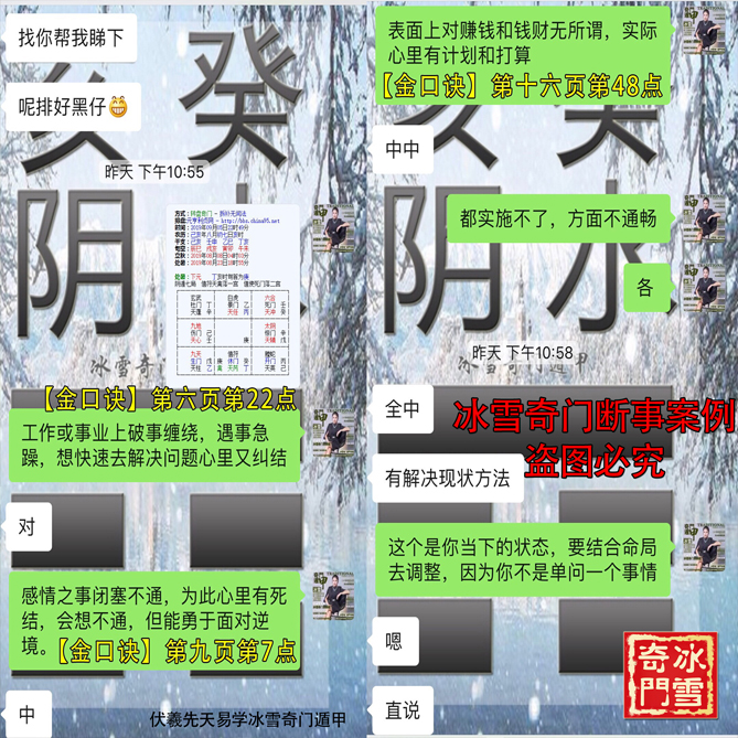 以下是冰雪老师给求测者使用【奇门遁甲秒断金口诀】对奇门局秒下判断,只字不差的案例: