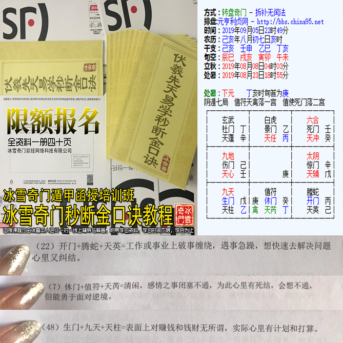 备注:函授培训课程均由冰雪本人提供一对一线上辅导和解答,附带文字纸质资料,一律不发电子版。《冰雪奇门遁甲秒断金口诀》函授培训课程限额报名,额满后当即取消函授课程,以【先天易学冰雪奇门面授培训】形式教学!