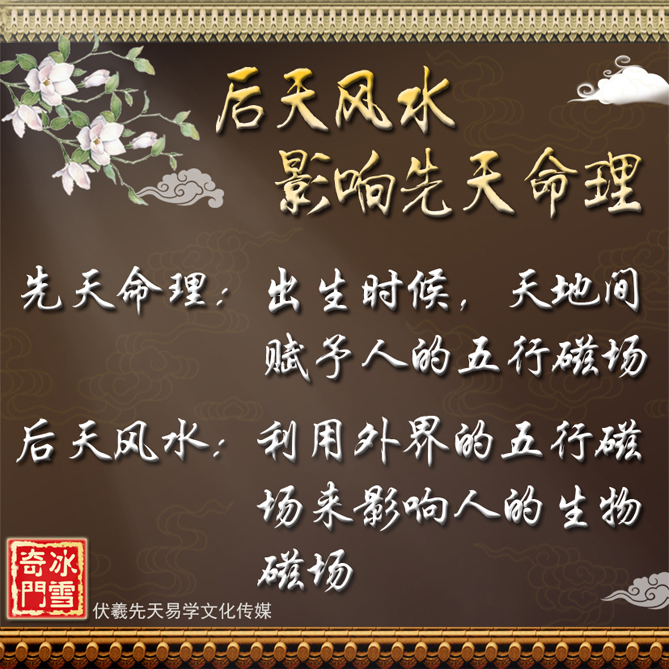 先天命理就是出生的时,天地间赋予人的五行磁场,是先天带来的,是人一辈子的大框,也是一生总体的格局。人一生的命运,主要受先天命理局的五行磁场基因和后天五行磁场的叠加影响而决定,运势就是后天干支轮转和环境等各种五行磁场随着时间的推移作用于人。我们可以改变的是在知道自己命理局的前提下,再借助后天的风水去干扰人的生物磁场,从而有限度的去影响人的先天命理。