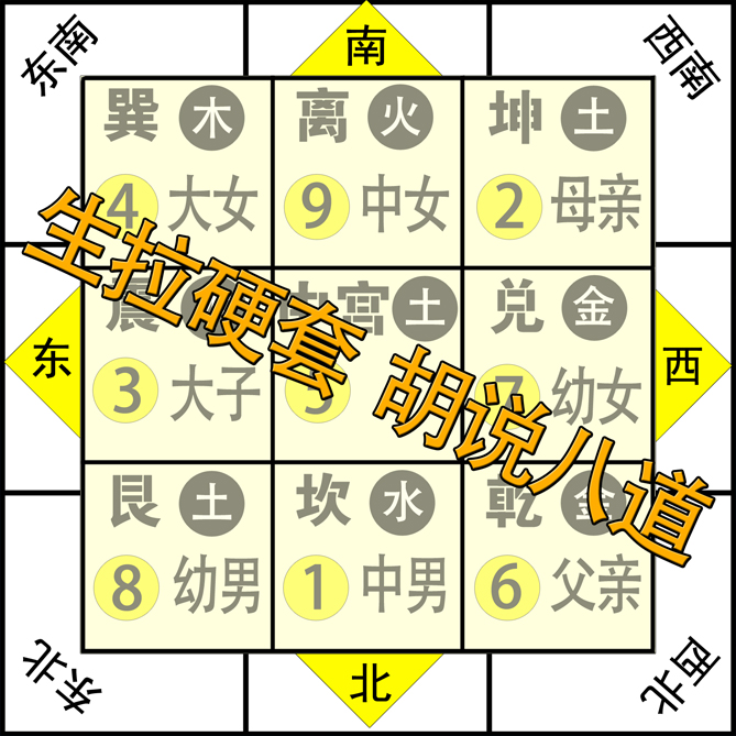 八卦等于九宫,九宫就是五行,大五行只有【水、火、木、金、土】,小五行再按其分为阴五行和阳五行。人是一个整体,是五行聚合物,是一个活动的五行俱全物质,怎么能把性别强行拆分,把“女性”放到4宫、9宫、2宫和7宫,把“男性”放到6宫、1宫、8宫和3宫?把人体各部位无限的强行拆分放至九宫当中,也纯粹是生拉硬套,胡说八道。