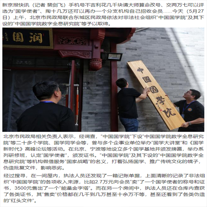 所谓的“中国国学院”于2019年5月27日已经被国家依法取缔。经有关新闻报道,此院是非法社会组织,他们伪造虚假文件行骗,以2.7万元多次卖出“国学使者”的称号,自事情暴露了以后,易学界随之揭开了一场风波。