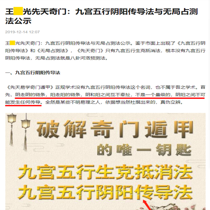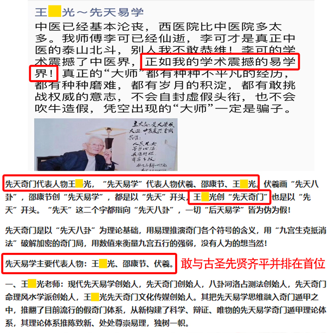 当代以先天八卦、先天易学为其基础用于教学培训的易学研究者并不多,伏羲先天易学冰雪奇门学派与王X光先天奇门王氏学派截然不同,请广大易学爱好者在求学之路上谨慎选择,以免被【先天奇门】错漏百出的谬论所误导!