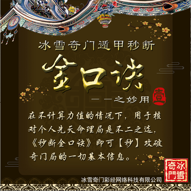 奇门局通过【九宫五行生克抵消法】和【九宫五行阴阳传导法】力值计算以后,【冰雪奇门遁甲秒断金口诀】用于占测个人先天命理局,可对求测者的一生进行精、简、准的概括。