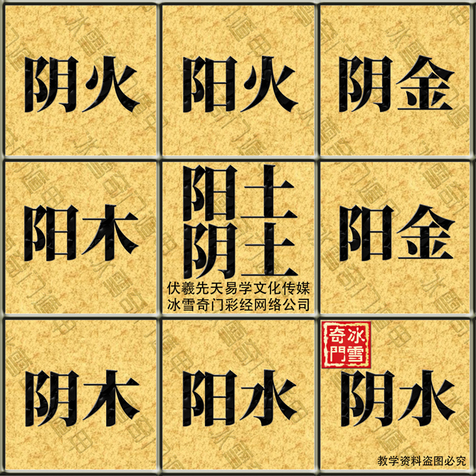 戊落5宫,属性为阳土,颜色为深黄;己落0宫,属性为阴土,颜色为淡黄。