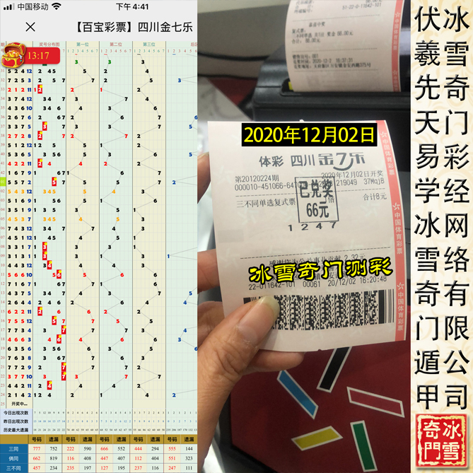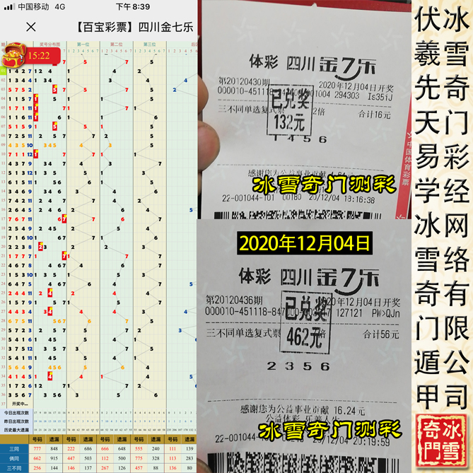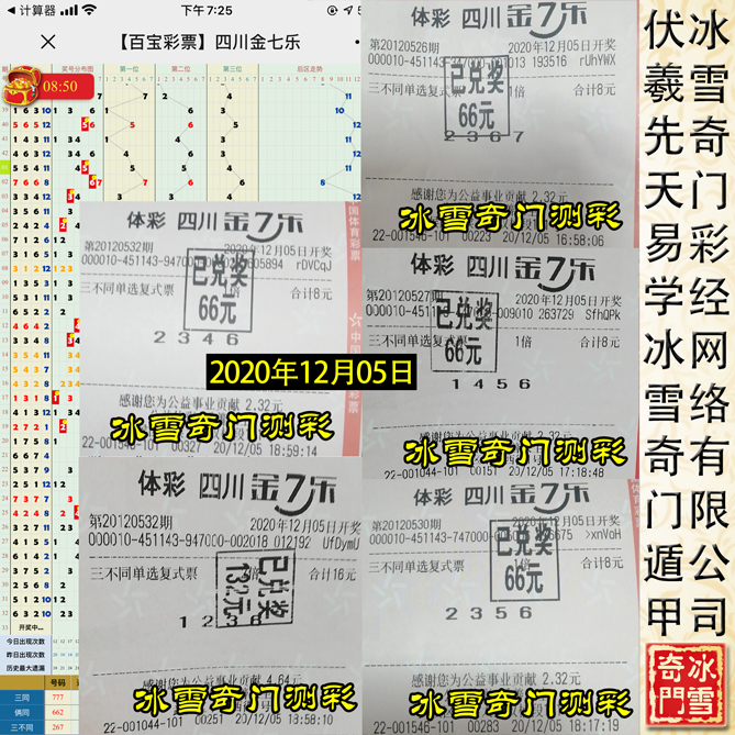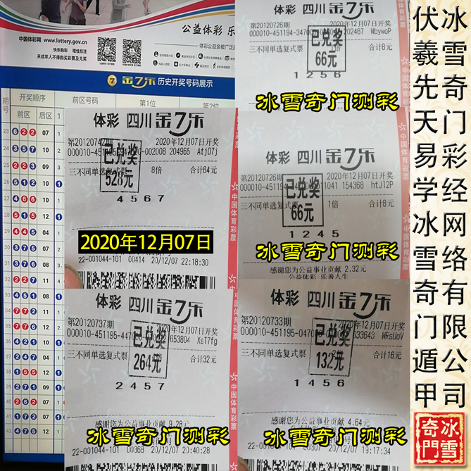 一切不能用于测-彩的奇门遁甲都为伪易学!以下为冰雪奇门遁甲测-彩班学生从2020年12月02日——2020年12月08日连续七天预测四川省体育彩票金七乐的案例,真正实现【稳赚不亏】的状态: