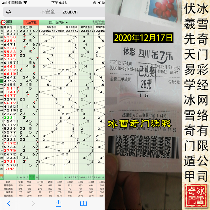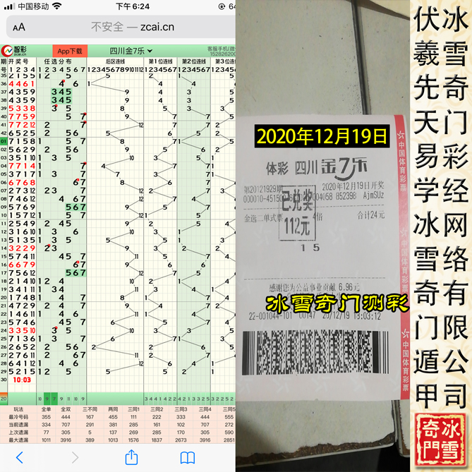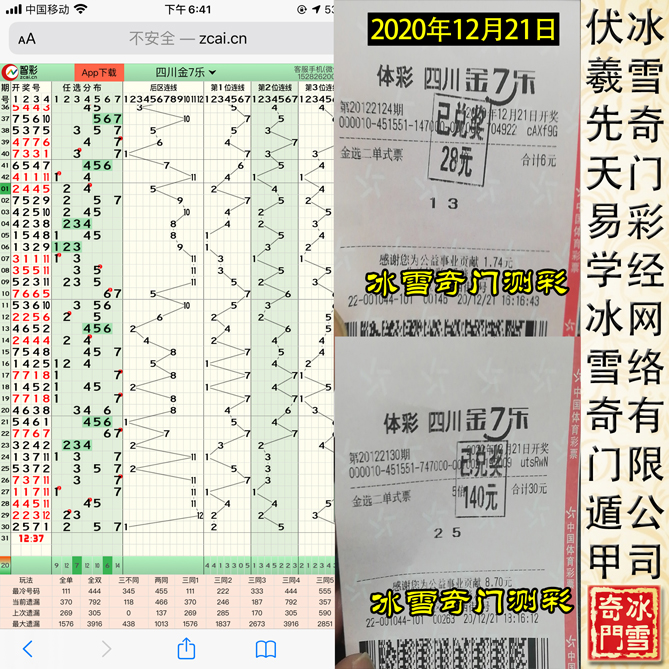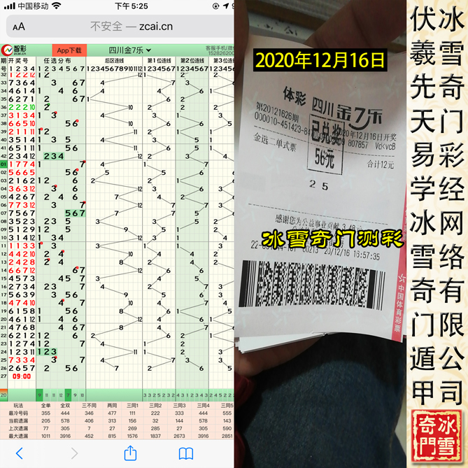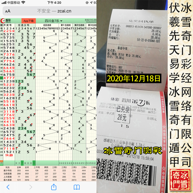 一切不能用于测-彩的奇门遁甲都为伪易学!以下为冰雪奇门遁甲测-彩班学生从2020年12月15日——2020年12月21日连续七天预测四川省体育彩票金七乐的案例,真正实现【稳赚不亏】的状态: