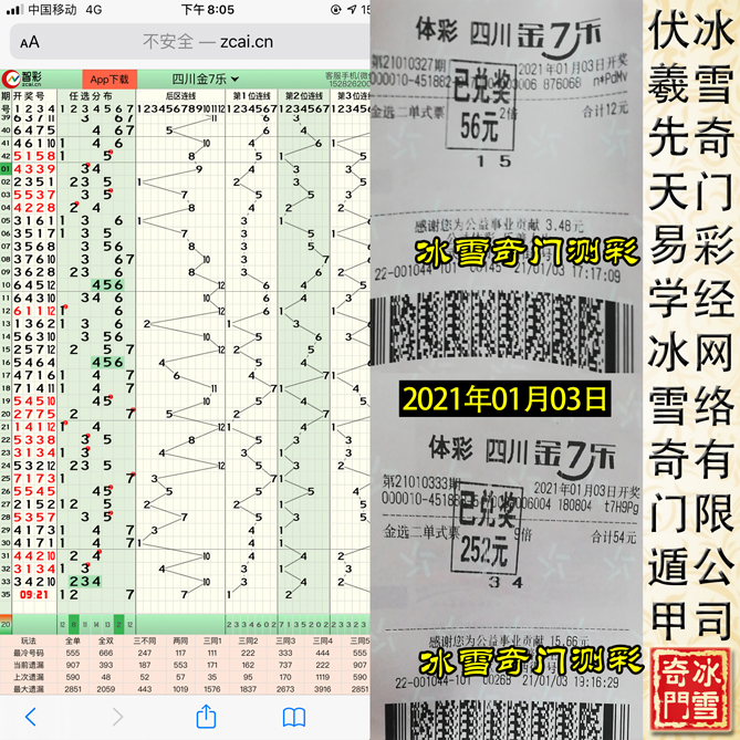 一切不能用于测-彩的奇门遁甲都为伪易学!以下为冰雪奇门遁甲测-彩班学生从2020年12月29日——2021年01月04日连续七天预测四川省体育彩票金七乐的案例,真正实现【稳赚不亏】的状态: