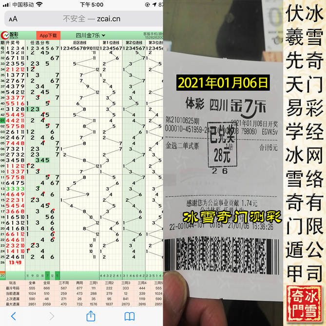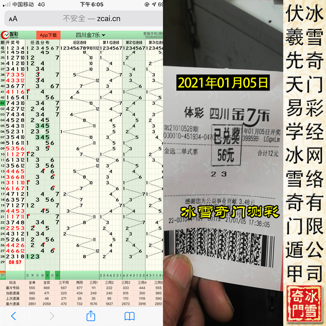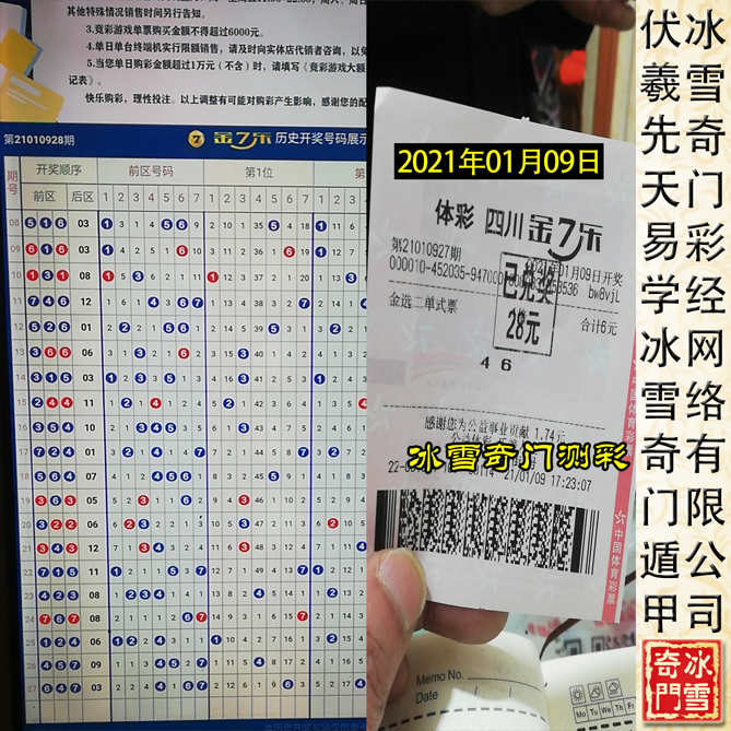 一切不能用于测-彩的奇门遁甲都为伪易学!以下为冰雪奇门遁甲测-彩班学生从2021年01月05日——2021年01月10日连续六天预测四川省体育彩票金七乐的案例,真正实现【稳赚不亏】的状态: