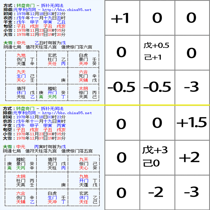 答案显然易见,确定【寅时局】为命主的格局。如有异议,请继续看力值分析。冰雪在前面所发表的文章中已经阐述过【九宫五行生克抵消法】+【九宫五行阴阳传导法】是破解奇门局的唯一钥匙,力值计算出来以后,我们再整体解读。