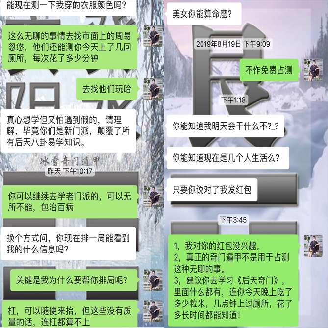 我想问这一帮人,是吃饱了撑着吗?简直就是无聊至极。预测学是这么用的吗?那些每天在占测别人中午吃了啥,穿了什么颜色的衣服,明天会不会下雨等等,有意义吗?这帮货色,我称之为“神经派”。