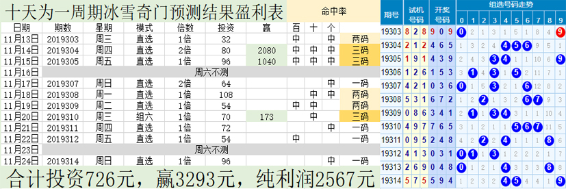 以下是我通过学习后,除周六不测以外,2019年303期至314期的中国福利彩票实践案例,现在分享给各位: