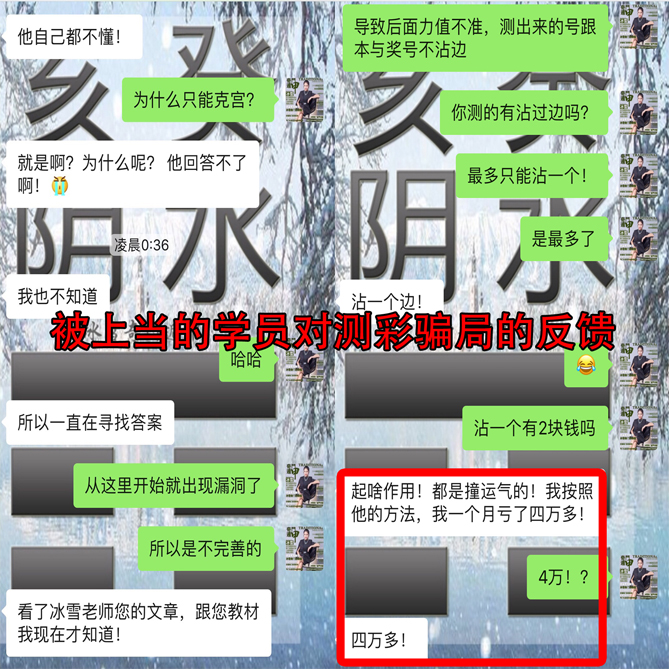 市面上有很多所谓的测-彩教程,你们都觉得这是真的吗?根本就是骗小孩的地摊破烂,只有无知的人才会相信!不少人都被忽悠了,结果都亏得一塌糊涂、赔了夫人又折兵!据被上当受骗的学员反馈,按其所谓的方法测-彩,一个月亏高达四万,请问这是什么数据?请问这是什么概念?有不少的易学忽悠,打着奇门测-彩的名义,在全国海量贩卖测-彩教程营生,比如:先天奇门王氏学派王X光,自称为先天易学界的“老祖宗”、奇门测彩第一人,以低价贩卖A4纸测-彩破烂,却始终未曾公开性的公布过测-彩结果。此人高举“打易学骗子”的旗号虚张声势,实则就是贼喊捉贼!冰雪曾多次诚意邀请王先生正大光明的接受比试,通过连续预测十天的福彩三D来验证学术。可王先生却以开奖造假,无法预测来逃避和推脱。试问,如果王先生觉得开奖造假,那请问为何要贩卖测-彩教材?岂不是祸害广大彩民和易学爱好者吗?