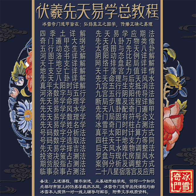【伏羲先天易学冰雪奇门遁甲总教程】(2021版)由四部分组成:伏羲先天易学基础、冰雪奇门遁甲预测大纲、风水命理姓名数理学、奇门遁甲应用。