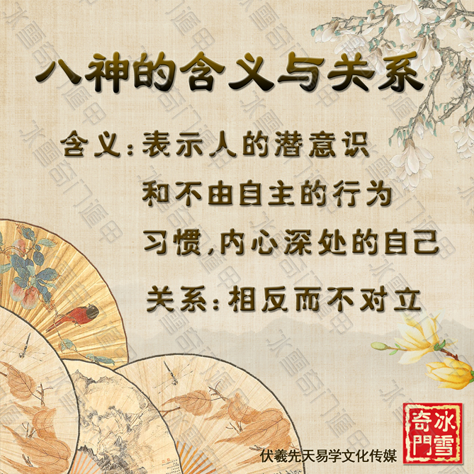 八神的含义:自然界对人、事、物的产生和发展起到一定作用的信息波和暗物质。八神是除了天干地支以外的天体,会无条件的作用于人。表示人的潜意识和不由自主的行为习惯。简单来讲就是内心深处的自己。