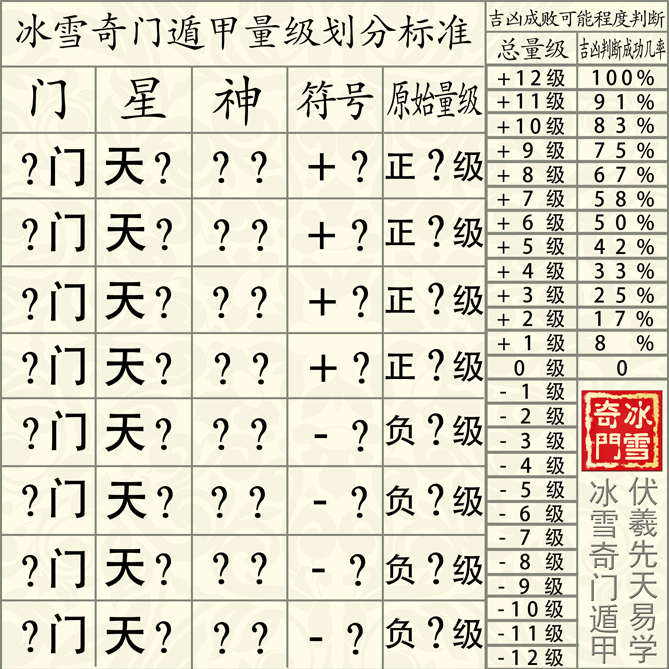 第三,不学习,不掌握奇门遁甲手工排盘,就永远无法结合冰雪奇门研创的门星神量级判断标准,从而对奇门局作出综合的,全面的,有量级标准的判断。冰雪在研究奇门的过程中,修正了先天奇门五行生克抵消法的偏差和漏洞,并在深入深究易理,广泛实践论证的基础上,首创了五行阴阳传导法用以计算奇门九宫五行力值的强弱。同时随着研究的深入,冰雪发现每个宫的五行力值,只是天地盘的(天干),对各宫的五行磁场影响,而门神星同样有量级,所以只有将奇门局中所有的易学元素全部划定出量级,才能综合全面看出局中显示出的所有信息,从而达到准确判断事物发展态势的目的。而只有系统学习了手工排盘,才能深入理解并结合冰雪耗时两年研创的量级划分标准,将事物产生发展变化,以及吉凶成败的可能性,用百分数(也就是百分之多少)来划定,比如可以结合冰雪的《奇门遁甲秒断金口诀》和《门星神量级划分标准》,判断一个事情有百分之多少的可能性会发生,或者损坏程度有百分之多少。任何人看都是一个结果,完全杜绝了模棱两可,没有标准,没有量化的想当然。