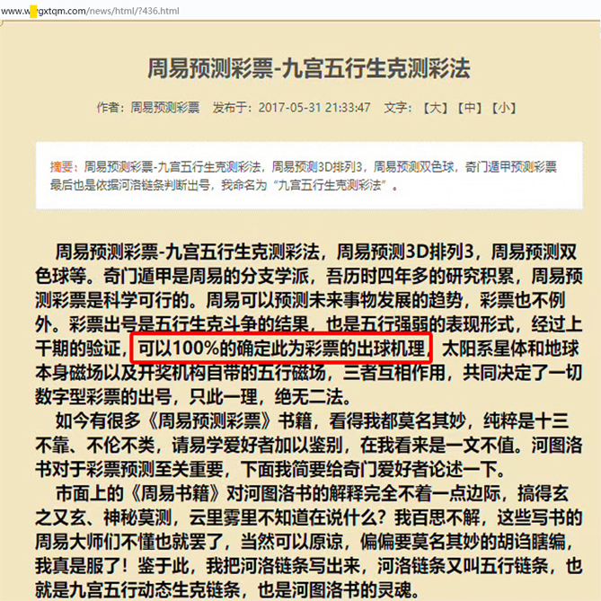 王先生在其个人网站以及诸多文章、宣传资料、教材中,特别是在其广告宣传中,狂妄宣称其百分百预测和洞晓出号规律和机理!冰雪在此对广大易学和奇门爱好者,以及现在还在痴迷于先天奇门王先生测-彩骗局的人,讲述以下观点,供大家思考: