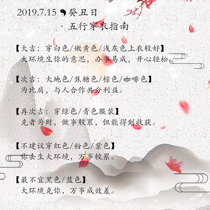 最吉利的穿衣就是:白色,嫩黄色,浅灰色,五行为金的颜色;