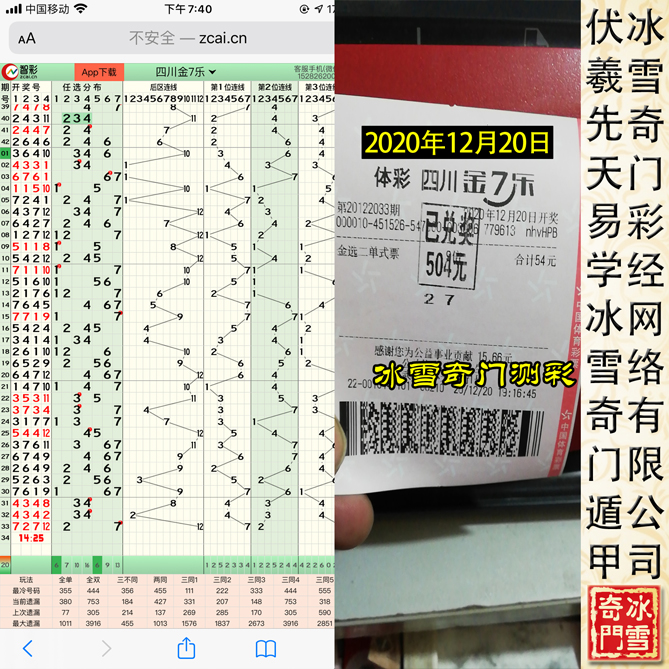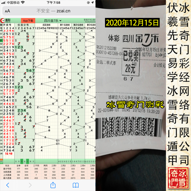一切不能用于测-彩的奇门遁甲都为伪易学!以下为冰雪奇门遁甲测-彩班学生从2020年12月15日——2020年12月21日连续七天预测四川省体育彩票金七乐的案例,真正实现【稳赚不亏】的状态: