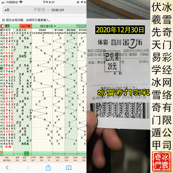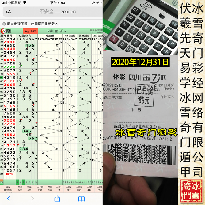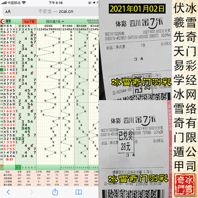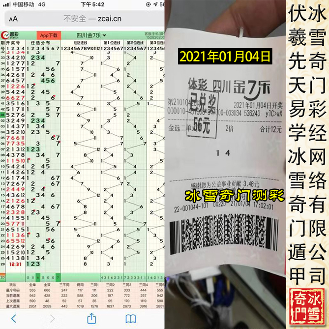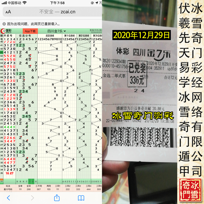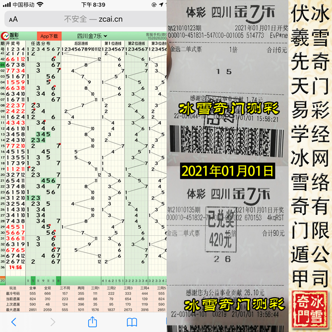 一切不能用于测-彩的奇门遁甲都为伪易学!以下为冰雪奇门遁甲测-彩班学生从2020年12月29日——2021年01月04日连续七天预测四川省体育彩票金七乐的案例,真正实现【稳赚不亏】的状态: