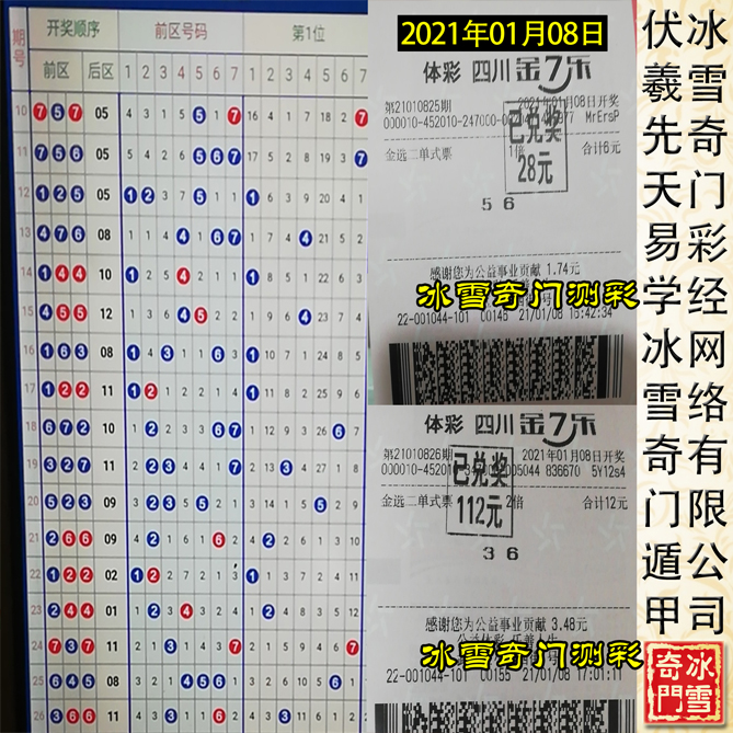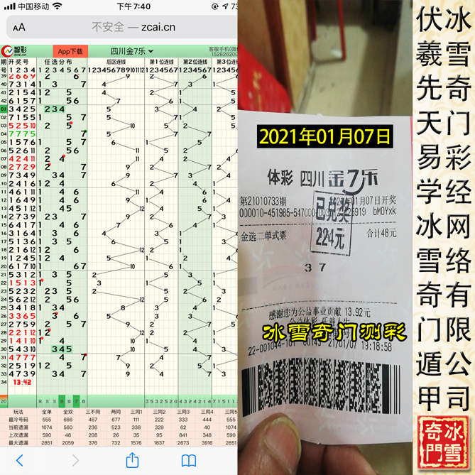 一切不能用于测-彩的奇门遁甲都为伪易学!以下为冰雪奇门遁甲测-彩班学生从2021年01月05日——2021年01月10日连续六天预测四川省体育彩票金七乐的案例,真正实现【稳赚不亏】的状态: